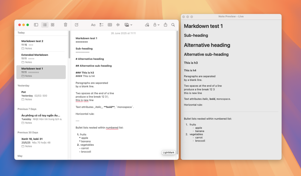 A macOS app that provides a live Markdown preview for Apple Notes. LightMark runs in the background and displays a floating preview window that renders your Apple Notes content in Markdown format.